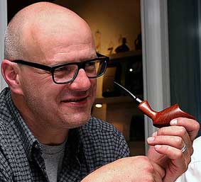 Schon als kleiner Junge in dem großelterlichen Hause faszinierte ihn der Pfeife- rauchende Großvater. Klar, daß der Geschicke Mächte walteten und die Faszination überhand gewann. Wann er zum ersten Male eine Pfeife in der Händen hielt, kann er nicht mehr exakt eruieren. Aber es war irgendwann im Büro seines Großvaters, wo er als kleiner Junge das Rauchholz in den Händen hielt und es fragend und fasziniert anstarrte. Spannend ist deshalb für mich, wie sehr kleine Details die gesamte Darstellung beeinflussen. Der z. B. um eine Winzigkeit nach vorne gekippte Kopf einer klassischen Prince oder Billiard verleiht der Pfeife eine komplett andere Ausstrahlung und Spannung. Diese Einflüsse versuche ich aufzugreifen und in der Herstellung meiner Pfeifen einzubringen. Neben diesen stilistischen Elementen spielen aber auch die funktionalen Aspekte (Kopf- und Rauchkanalbohrung, Biß etc.) eine entscheidende Rolle. Die Pfeife ist ein Rauchgerät und somit auch an technischen Aspekten zu messen. Eine besondere Rolle spielt dabei der Biss. Der unmittelbarste Übergang zwischen Pfeife und Raucher ist nun mal diese Stelle. Willkommen in meiner Pfeifengalerie hier bei Estervals Pipe House! |