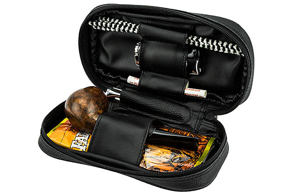 Diese funktionale Pfeifentasche in eleganter schwarzer Lederoptik mit burgunderfarbenem Akzent ist der ideale Begleiter für unterwegs. Sie bietet sicher gepolsterten Platz für bis zu zwei Pfeifen sowie spezielle Halterungen für Pfeifenbesteck, Reiniger und Filter. Zusätzlichen Stauraum bieten die praktische Vortasche sowie ein separates Reißverschlussfach auf der Rückseite, in dem sich Kleinteile sicher verwahren lassen.