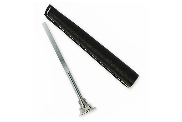 Seine kompakte Größe macht ihn zum idealen Begleiter für unterwegs – er passt problemlos in jede Pfeifen- oder Jackentasche. Die braune Lederummantelung verleiht ihm einen edlen, zeitlosen Look, während der herausdrehbare Dorn zusätzliche Flexibilität bietet.