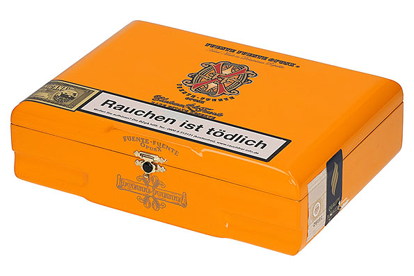 Die quietschgelben Kisten beherbergen die »Fuente Fuente OpusX Oscuro Oro«. Die Deckblätter für diese wunderschöne Zigarre kommen direkt vom Chateau der Fuente-Familie. Diese speziell und sorgfältig selektierten Blätter unterlaufen einen besonders langen Fermentations- und Reifeprozess. Das führt zu der nachtdunklen Farbe und verleiht diesen Preziosen einen kräftigen, aber ausbalancierten Geschmack.