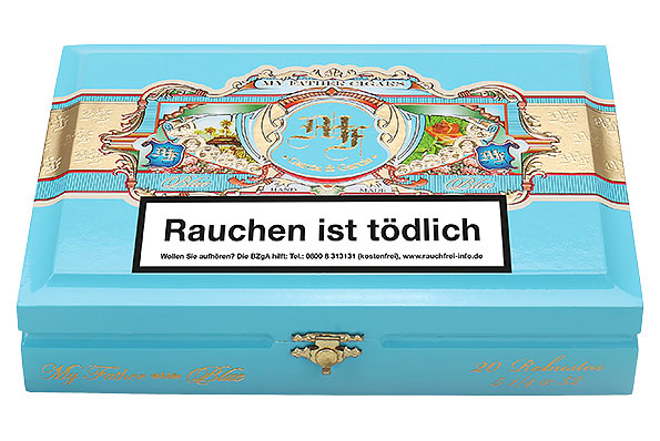 My Father Blue Ein neues Kapitel Mit der »My Father Blue« betritt nicht einfach nur eine neue herausragende Zigarre das Rampenlicht. Nein, die Blue öffnet ein neues Kapitel für eine der größten Zigarrendynastien unserer Zeit. Denn um diese fantastische Zigarre zu erschaffen, zog es die Familie Garcia nach Honduras. Vor etwa drei Jahren entschied man sich dazu, zu expandieren, und baute eine Fabrik in der honduranischen Zigarrenhauptstadt El Paraiso. Um auch in Honduras eigenen Tabak kultivieren zu können, kaufte man Felder in Talanga, einem der renommiertesten Anbaugebiete in Honduras. Das Farmland war zuvor nicht für Tabak genutzt worden und liefert gleich drei verschiedene Böden, die es dem Don und seinem Sohn Jaime ermöglichen, leichte sowie kräftigere Tabake anzubauen. Als Umblatt und Einlage kommen nun zum ersten Mal Tabake von der »Finca La Opulencia« zum Einsatz. Gekrönt von einem wunderbar öligen Connecticut-Broadleaf-Deckblatt, ist die My Father Blue mit Sicherheit die am sehnsüchtigsten erwartete Zigarrenneuheit des Jahres. Deswegen freuen wir uns, Ihnen diese Neuheit hier bei den New Icons präsentieren dürfen. In auffälligen blauen Kisten, die eine Hommage an die Flagge von Honduras darstellen, kommt sie daher. Ein zweiter Zigarrenring zeigt das Jahr des Releases MMXXV (2025) und gibt der Blue neben dem ersten Ring, der geschmückt wird vom klassischen My- Father-Logo, einen edlen Anstrich.