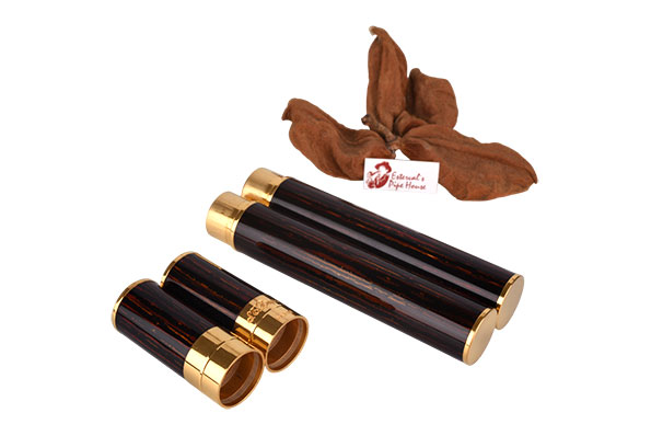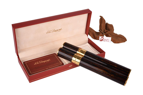 Das S.T. Dupont Cigar Tube bietet zwei Cigarren unterwegs erstklassigen Schutz und präsentiert sich im edlen Macassar‑Ebenholz‑Look. Die schlanke, zylindrische Form liegt angenehm in der Hand und passt mühelos in Tasche oder Aktenkoffer.