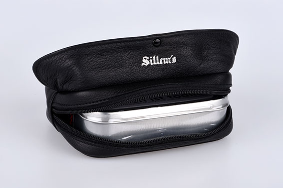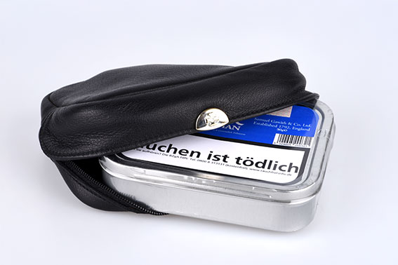 Sillem’s Tabakdosen-Tasche – Schwarz Die schwarze Tabakdosen-Tasche von Sillem’s ist ein stilvoller Begleiter für Liebhaber gepflegter Rauchkultur. Gefertigt aus feinem Metislammleder, überzeugt sie durch ihre weiche, geschmeidige Haptik und eine zurückhaltend elegante Ausstrahlung. Eine kleine Applikation setzt einen dezenten Akzent und unterstreicht den Anspruch an Qualität und Handwerkskunst. Mit ihren Maßen von 13 × 9,5 × 3,5 cm bietet die Tasche idealen Platz für eine 50-Gramm-Tabakdose, beispielsweise von Samuel Gawith, und schützt den Inhalt zuverlässig. Der Reißverschluss sorgt für sicheren Verschluss, während das geringe Gewicht von 53 Gramm sie zum perfekten Begleiter auf Reisen oder im Alltag macht. Diese Tabakdosen-Tasche ist mehr als eine Hülle. Sie ist Ausdruck von Sorgfalt, Stilbewusstsein und der Wertschätzung für hochwertige Materialien – ein Accessoire für Menschen, die auch bei kleinen Dingen keine Kompromisse eingehen.