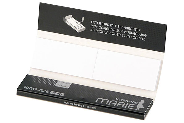 Alles, was du brauchst, in einem Heftchen: MARIE King Size Slim Ultrafine inklusive Filter-Tips. Das ultrafeine, gebleichte Papier ist extrem dünn und brennt besonders langsam ab, damit der Genuss im Vordergrund steht. Das Heftchen enthält nicht nur 34 hochwertige Papers, sondern auch 34 passende Filter-Tips. Die Tips sind perforiert und lassen sich sowohl im Regular- als auch im Slim-Format verwenden. Dank des praktischen Magnetverschlusses bleibt das Heftchen immer sicher verschlossen.