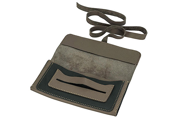 Die Drehertasche aus hochwertigem Leder in Grau und Ozeanblau bietet ausreichend Platz für Tabak, 100er Zigarettenpapier und weiteres Zubehör. Das Innenfach sorgt für Übersicht, während die Seitenfalte zusätzlichen Stauraum bietet. Die elegante Kontraststeppung und das Lederband machen die Tasche zu einem stilvollen Begleiter für unterwegs.