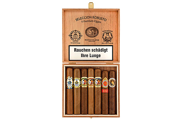 August Schuster Seleccion Robusto Sampler Das August Schuster Seleccion Robusto Sortiment bietet eine exzellente Auswahl von sieben handgerollten Longfiller-Zigarren im beliebten Robusto-Format. Jede Zigarre repräsentiert die hohe Kunst der Tabakmischung und stammt aus renommierten Marken des Hauses Schuster. In diesem Sampler werden Klassiker wie Casa de Torres, Rodrigo de Jerez und Maria Mancini vereint. Dieses Set ist ideal für Aficionados, die die geschmackliche Bandbreite der Schuster-Manufaktur entdecken wollen. Die Fertigung erfolgt traditionell „totalmente a mano“, was höchste Qualität und ein perfektes Zugverhalten garantiert. Durch die unterschiedlichen Provenienzen der enthaltenen Zigarren bietet das Sortiment eine spannende Reise durch die Tabakwelten von Nicaragua und Honduras. Ein toller Sampler mit 7 wunderbaren Zigarren im Format Robusto, von sahnig-mild bis üppig-würzig, wird dieses Set jeden Genießer erfreuen. Geschmack (Casa de Torres): Mild, cremig mit feiner Süße. Geschmack (Maria Mancini): Mittelkräftig, klassisch würzig mit Holz- und Röstaromen. Geschmack (Rodrigo de Jerez): Ausgewogen, aromatisch und vollmundig.